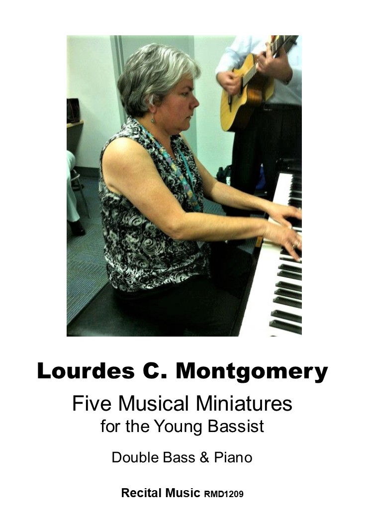 Five Musical Miniatures for the Young Bassist is a suite is fun and engaging pieces by Lourdes C. Montgomery. Each piece features a number of …musical or technical skills appropriate to the beginner bassist in music which is lively and instantly appealing. The accompaniments are simple and supportive, aimed at the double bass teacher with some pianistic skills, and these are ideal study of concert, Repertoire which are both player and audience friendly 1. A Wooden Soldier patiently waits, hidden away in his dark toy box, ready to march about the playroom at a moment’s notice. The “col legno” variation conjures an image of the fellow growing tired of his pageantry as his legs and arms begin to bang together with a knock, knock, knock. 2. Daydreaming is perhaps one of the favourite pastimes of many a schoolboy who, in the warmth of a lazy afternoon, finds himself with some free time when his studies and chores are all done, reflecting on ideas that come and go like so many boats drifting by on the slow moving channel of a nearby river. 3. The Storm first presents itself with low rumblings of a distant thunder, soon followed by flashes of lightning and the strong winds which usher in dark rolling clouds that release torrents of rain upon anyone unlucky enough to be caught outdoors with no nearby shelter. As the storm passes the rumblings of thunder can once again be heard in the distance. 4. As night falls on the islands of the Caribbean the natives begin a festive carnival with A Tropical Dance. Percussive elements of this little piece, as well as the subtle syncopations of the pizzicato section, may remind us perhaps of the African roots still pervasive in the music of the region. 5. A celebration of my own relocation to the northwest corner of Arkansas, Ozark Mountain Fun commemorates the many Scottish and Irish pioneers who long ago settled the hills of this area and brought to it the instruments and dance-like music of their homeland, newly reinvented to reflect their new surroundings. [Programme notes by Lourdes C. Montgomery]