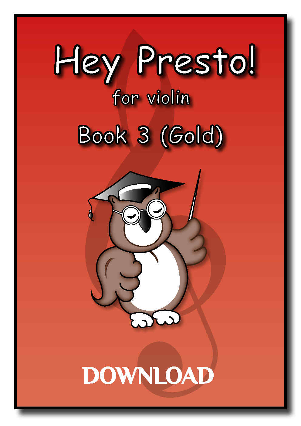 Book 3 (Gold) in the Hey Presto tutor series for violin. Beginning with an in-depth explanation of how sharps work on the violin – and later, flats – …this book introduces the violin student to new finger positions, keys, scales and arpeggios and 3rd position.