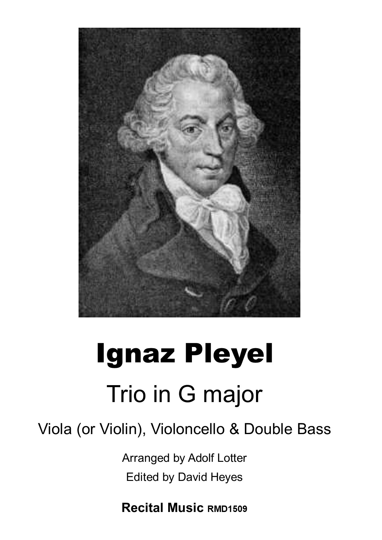 Pleyel’s Trio in G major is a bright and vibrant work and was arranged for viola, violoncello and double bass by the Czech bassist-composer …Adolf Lotter. In four contrasting movements, there are solos for each player, with the double bass part being far more than simply a continuo role, and this would be effective as recital repertoire or simply as fun and accessible music to play with friends. A manuscript of the trio was discovered in the archive of Adolf Lotter, acquired by David Heyes some years ago and, on closer inspection it is probably an elaboration of the original trio with tasteful and elegant embellishments and additions composed by Lotter. The transcription is effective and accessible to the intermediate ensemble and this first edition includes parts for viola or violin.